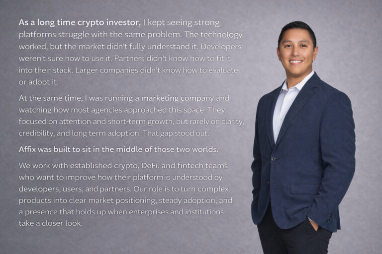 Affix Marketing works with established Crypto, DeFi, and Onchain Platforms that are already live in the market and focused on long-term adoption.
